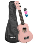 This soprano ukulele in a charming pink finish features a linden body, delivering bright and cheerful tones. A delightful choice for players seeking a playful and stylish instrument.
